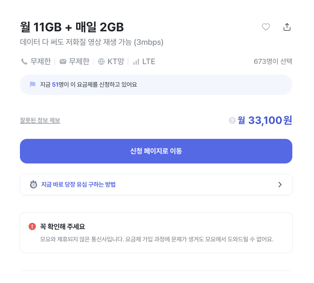 - 요금제: 데이터 안심 11GB+매일 2GB