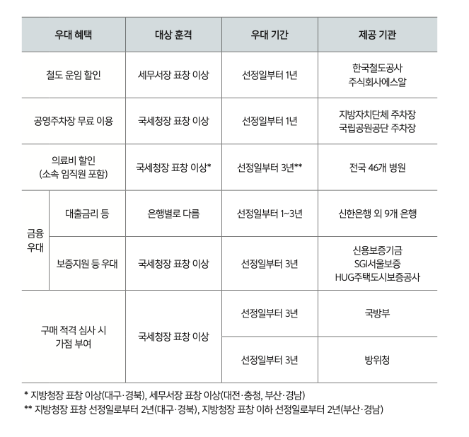 - 세무조사 유예: 국세청장 표창 이상(선정일로 부터 3년), 지방청장 표창 이하(선정일로부터 2년)