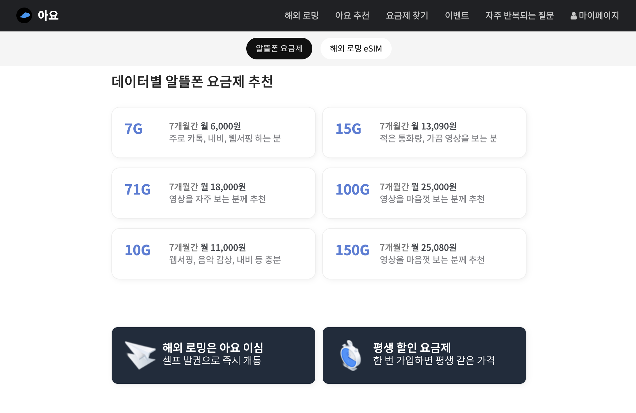 아요는 사용자의 데이터 사용량과 통화 패턴을 분석하여 맞춤형 요금제를 추천해주는 플랫폼입니다. 또한, 해외 로밍 요금제와 eSIM 서비스도 제공하여 해외여행이나 출장 시에도 유용하게 활용할 수 있습니다.