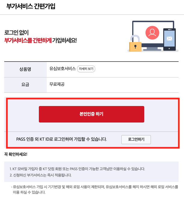 - 앱: My KT > 전체메뉴 > 상품 > 모바일 > 부가서비스 > 유심보호서비스 신청